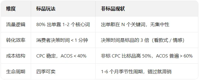 最近后台被非标品卖家的吐槽刷了屏:做季节性家居装饰,刚把关键词投准就过季了,库存压了 3000 件;鞋服变体投了 6 个 SKU 广告,ACOS 冲到 90%;卖 10 单亏 8 单;首饰类关键词散得像沙子,投流像撒胡椒面,钱花了流量没转化。
