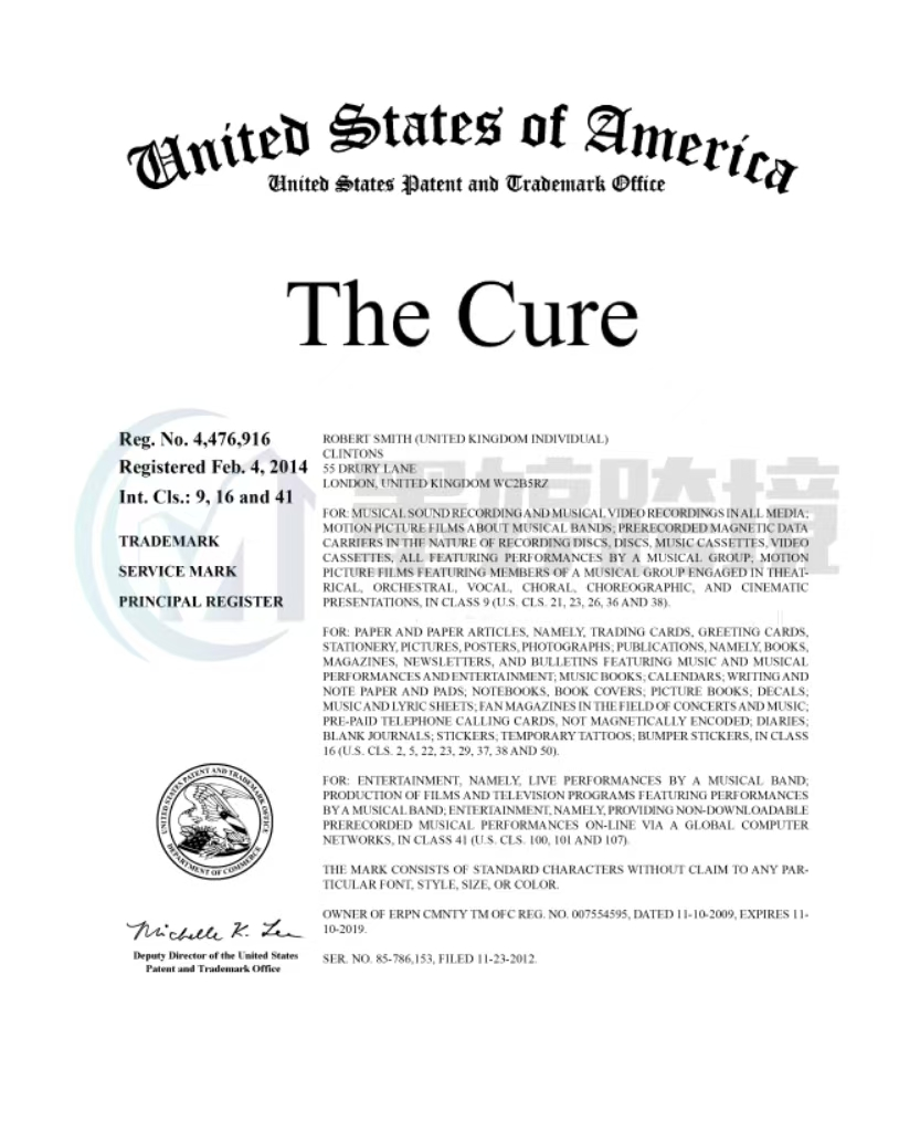 本案为商标侵权,原告旗下注册图文商标众多,维权关键词:The Cure ;注意:未经授权不能随意使用,侵权风险极大!