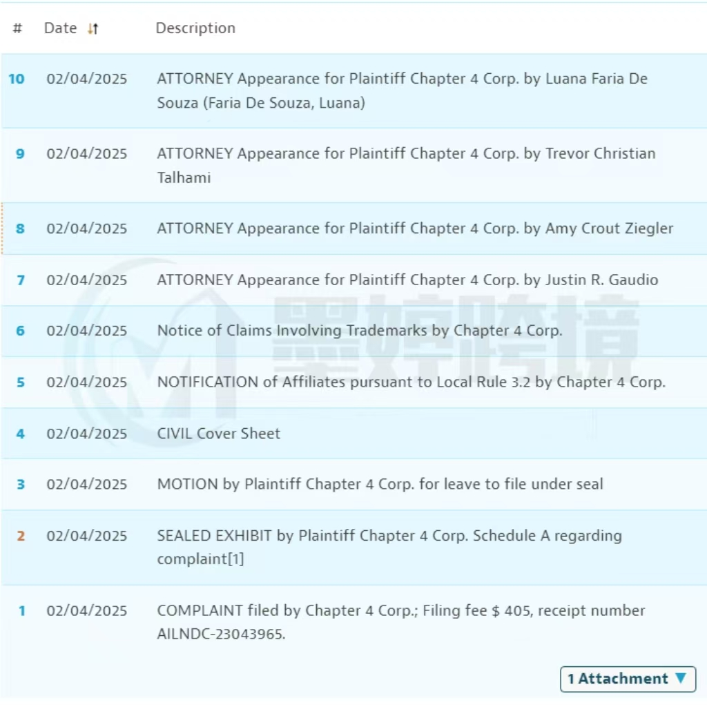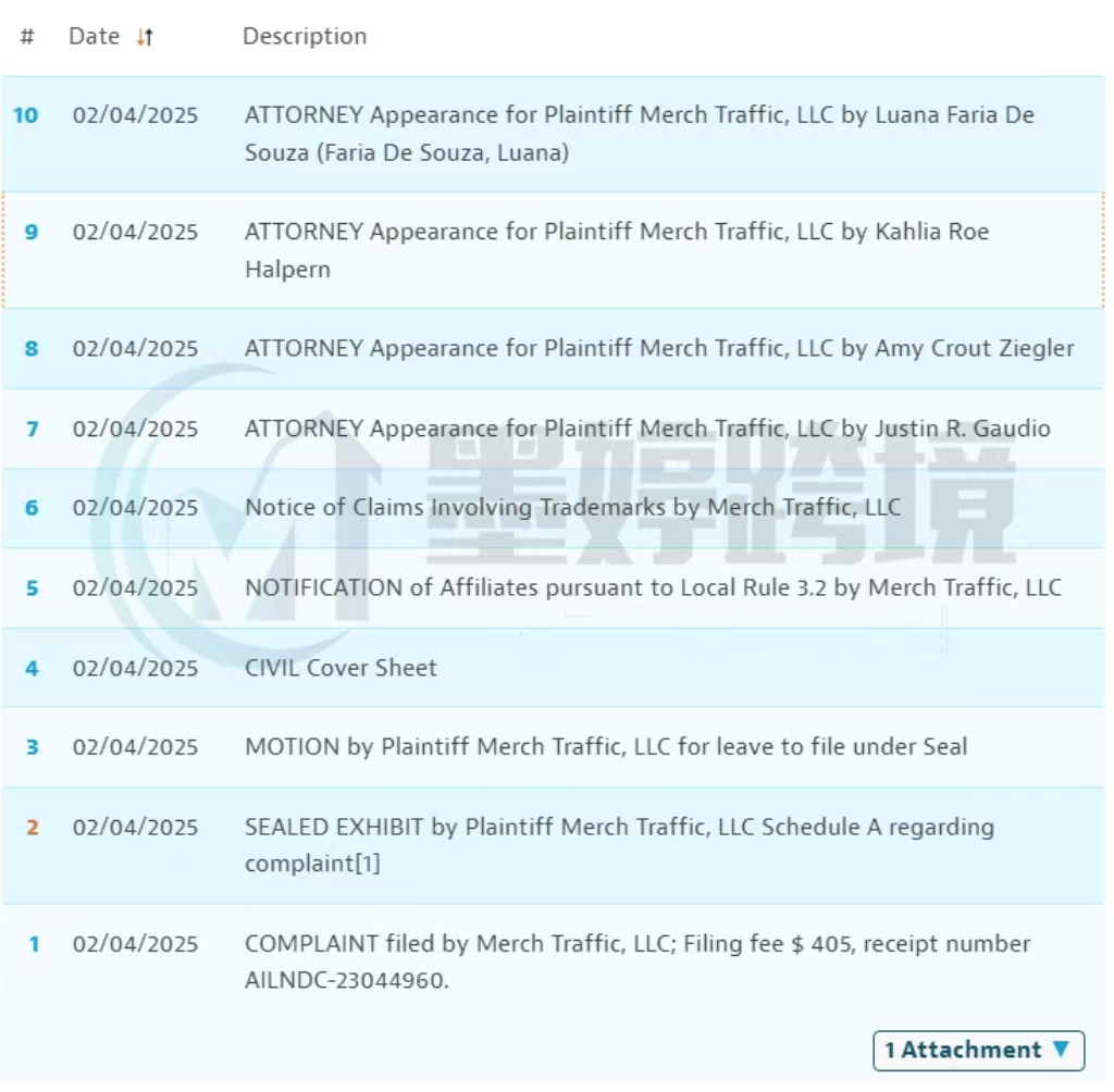 本案于2025年2月4日发起侵权诉讼,案件号:25-cv-01180,原告尚未提起TRO禁令(Temporary Restraining Order,临时限制令)。