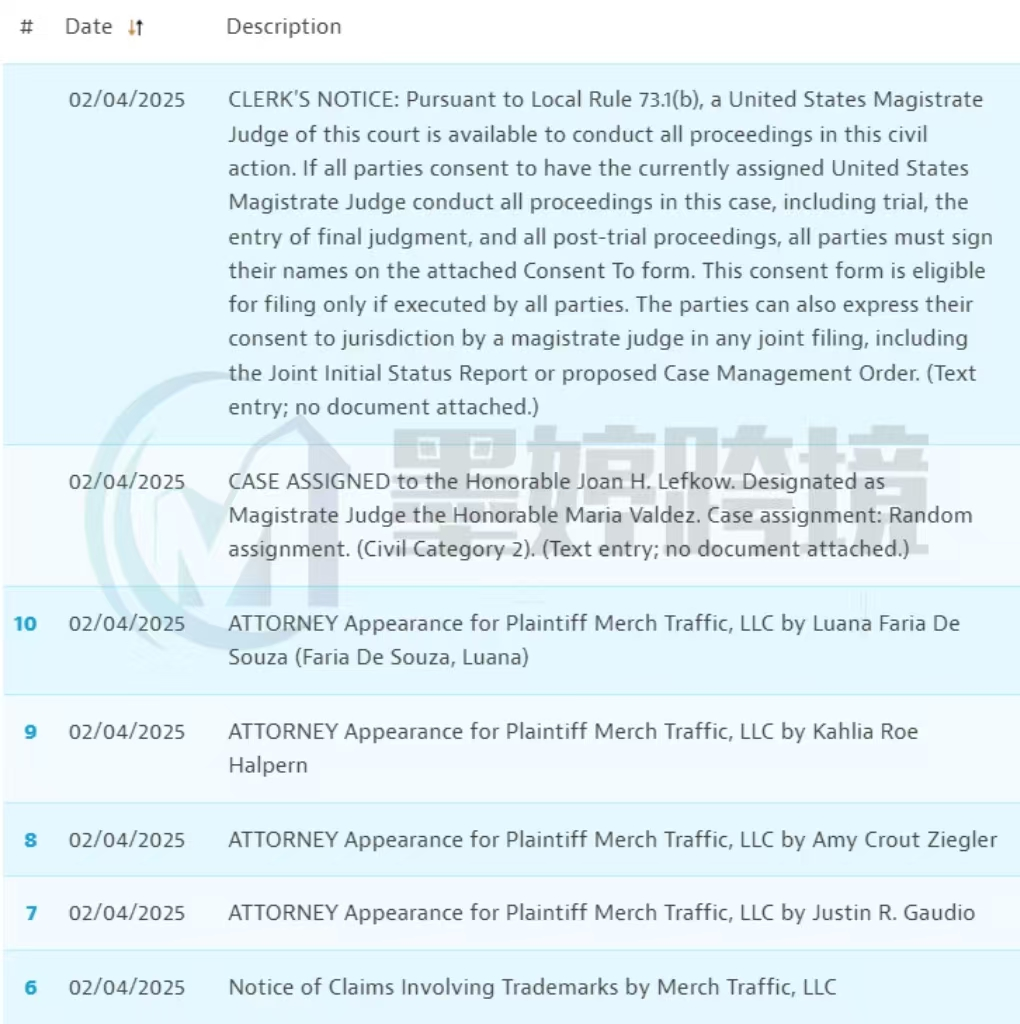 本案于2025年2月4日发起侵权诉讼,案件号:25-cv-01197,原告尚未提起TRO禁令(Temporary Restraining Order,临时限制令)。