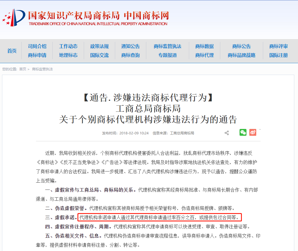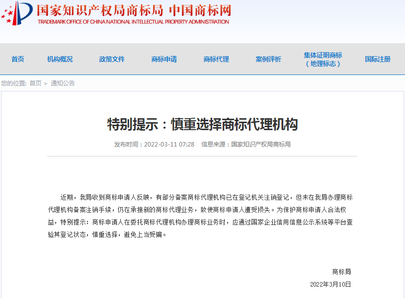 3月11日,商标局发布特别提示:慎重选择商标代理机构。