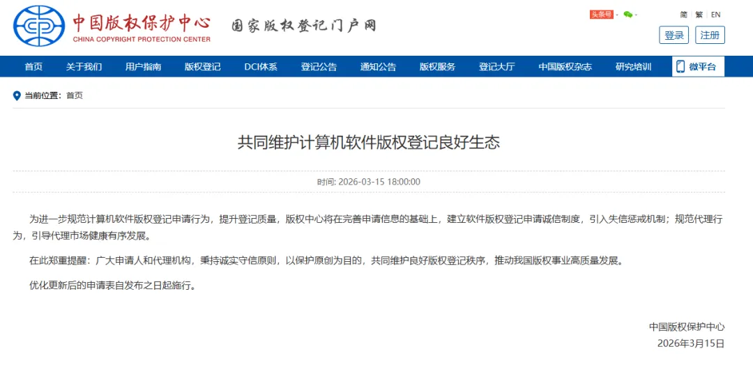 15日,中国版权中心再次发布消息:为进一步规范计算机软件版权登记申请行为,提升登记质量,版权中心将在完善申请信息的基础上,建立软件版权登记申请诚信制度,引入失信惩戒机制;规范代理行为,引导代理市场健康有序发展。在此郑重提醒:广大申请人和代理机构,秉持诚实守信原则,以保护原创为目的,共同维护良好版权登记秩序,推动我国版权事业高质量发展。