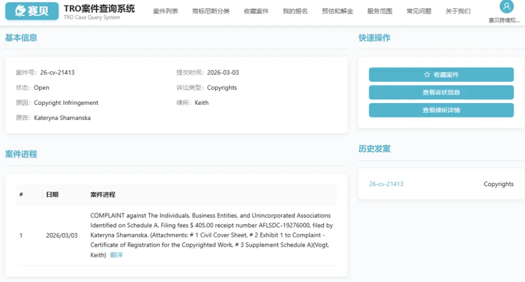 从赛贝TRO案件查询系统获悉,2026年03月03日美国佛罗里达州法院受理26-cv-21413版权侵权TRO诉讼,原告为乌克兰籍原创设计师Kateryna Shamanska,由Keith律所代理,案件涉及了一张无缝拼接作品版权侵权,版权登记号为VA 2-453-002。
