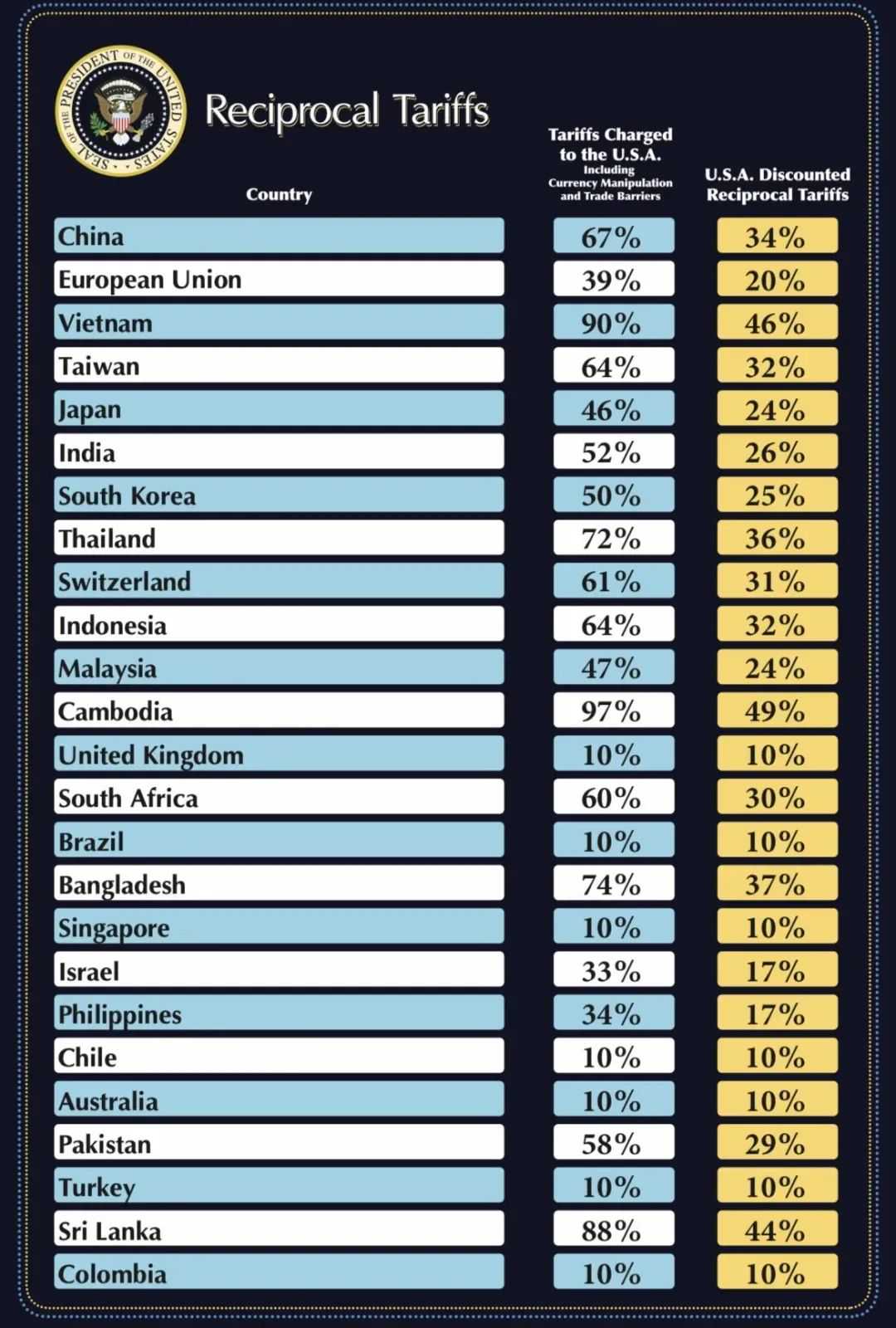 特朗普展示的图表详细揭示了新关税政策的具体内容:美国将对所有进口商品征收10%的基准关税,无一例外。