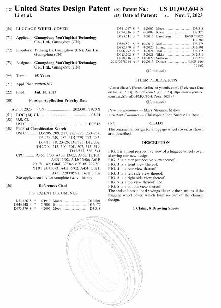在看到有包括亚马逊等多个跨境平台涌现了大量通过低价销售、虚假宣传等手段售卖类似注册了US D1003604S专利的行李箱滑轮套。