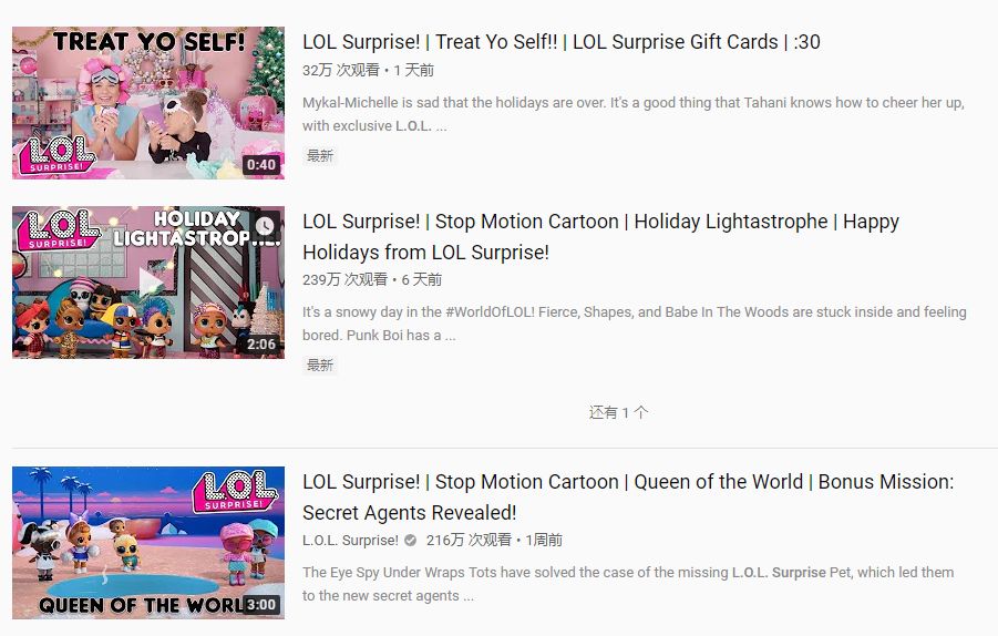 LOL Surprise的爆红和它在YOUTUBE上的病毒式传播也密不可分,小编注意到各种各样的LOL Surprise娃娃系列开箱视频都很火爆,不少视频的观看量达到几十万,甚至还有少数关于该产品的视频播放量达到了几百万。