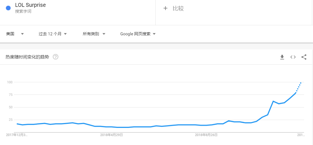 小编注意到,LOL Surprise谷歌搜索趋势也相当强劲,大约从今年秋季该产品的搜索热度迅速飙升,大约在11月中旬感恩节前几天,该产品的搜索热度突然大幅提升,随后在圣诞来临之前继续保持增长势头。