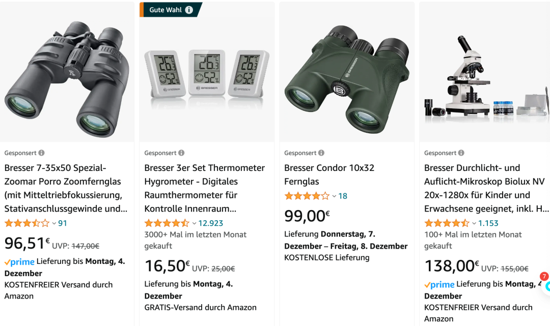 晶华光学旗下的Bresser品牌,在亚马逊欧洲站拥有多款热销产品。例如温湿度传感仪,在亚马逊德国站的一款链接拥有超过1.2万个评论,月销量超过3000个。