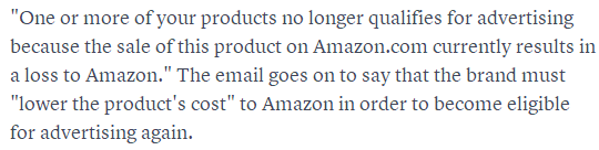 “你有一款或多款产品不再具备进行广告促销的资格,因为目前在亚马逊上销售该产品会给亚马逊造成损失。如需获得广告投放资格,品牌必须要‘降低产品成本’”。