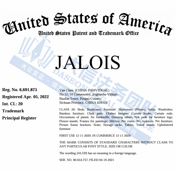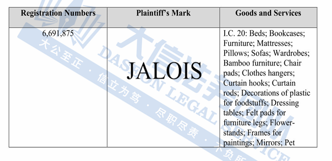 此案为商标维权,涉及一个商标为:JALOIS维权,注册第20大类,涵盖家具、衣架、窗帘配件、食品用塑料装饰品、花架、镜子、宠物箱等领域,以下是涉及商标的具体信息,未经授权不得擅自使用,跨境卖家尽快检索下架,避免TRO侵权风险!