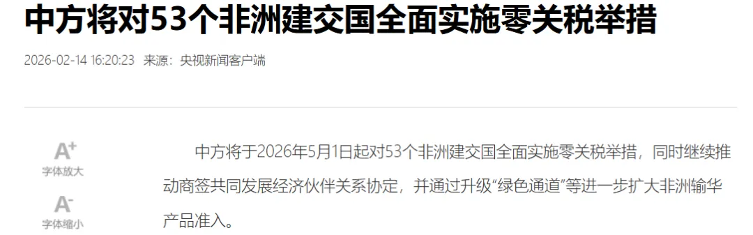 2月14日的新闻报道,第39届非洲联盟峰会中方宣布将于2026年5月1日起对53个非洲建交国全面实施零关税举措。