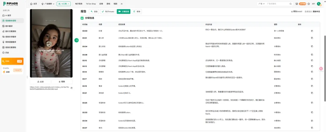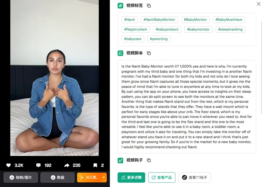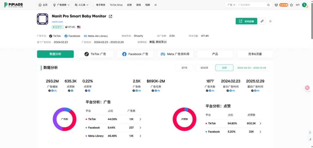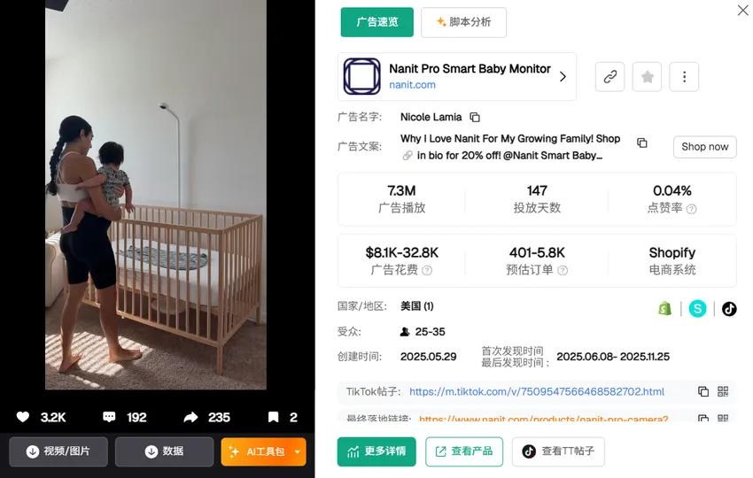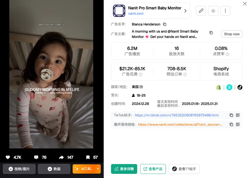 这条素材是 Nanit 当前投放体系中广告展现量排名第二的单条内容。根据 PiPiADS 数据显示,该广告累计获得 6.2M 次广告展现,集中投放 16 天,在较短周期内迅速放量,表现出明显的高效扩散能力。与第一条偏长期稳定投放的素材不同,这条内容更像是一轮被快速验证并放大的表达尝试。