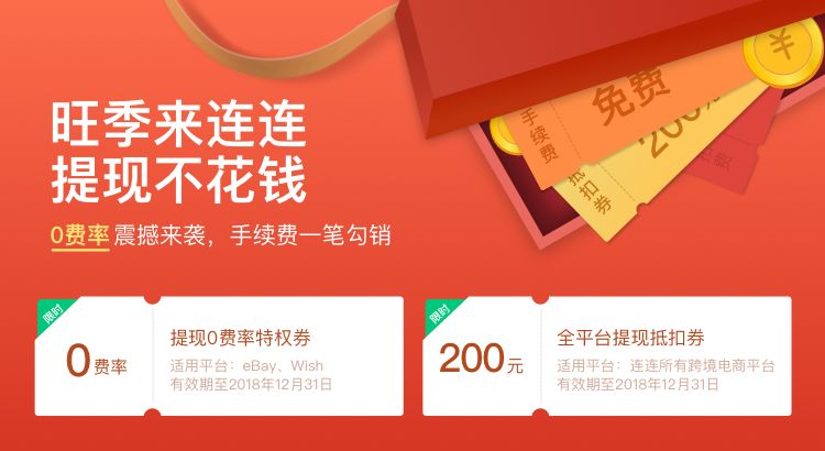 作为革新行业的跨境支付工具,连连跨境支付继推出7*24小时提现,帮助30万跨境卖家彻底告别银行账期后,又一次突破行业壁垒,全新推出——eBay、Wish平台0费率活动!更有全平台提现费率200元抵扣券!