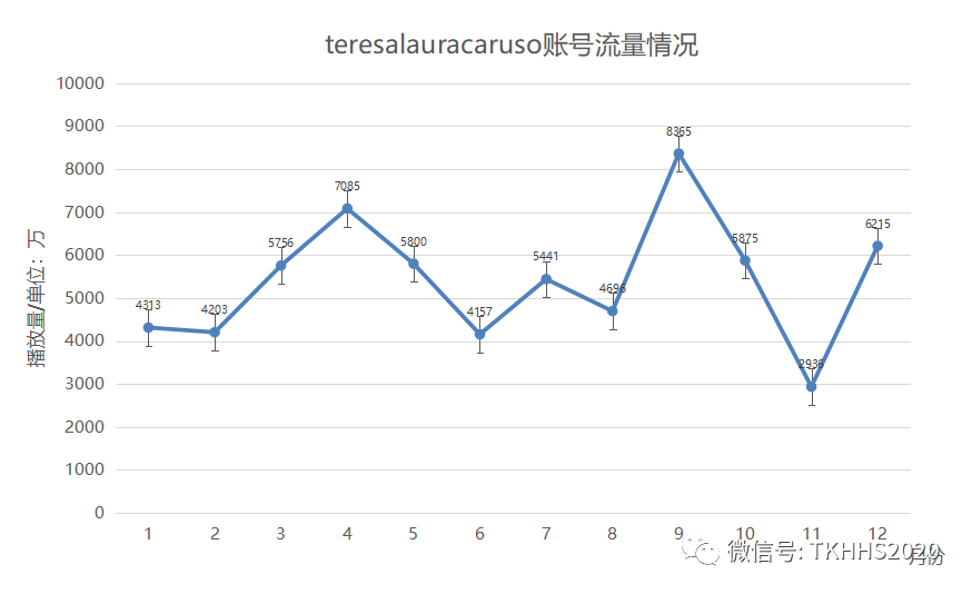 1M=100万,这个账号从去年1月28日至今运营1年多,已经拥有280万粉丝,8600万点赞,光是这张截图的视频播放量总和将近一个亿。我对此账号一年内流量分析做成了以下图表: