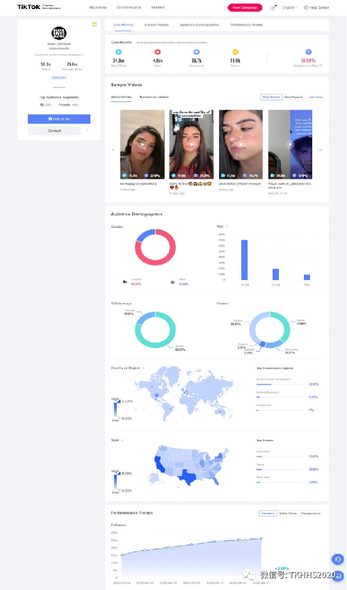 一般优质的红人都是积累了大量的活跃用户,在TikTok通过视频的展现方式推荐产品,引导粉丝点击主页链接购买。如案例图片中可以看到TeresaCaruso单视频平均在100万的播放量,平均一个月的播放量在5000万左右,并且往期的视频流量是持续至今的。