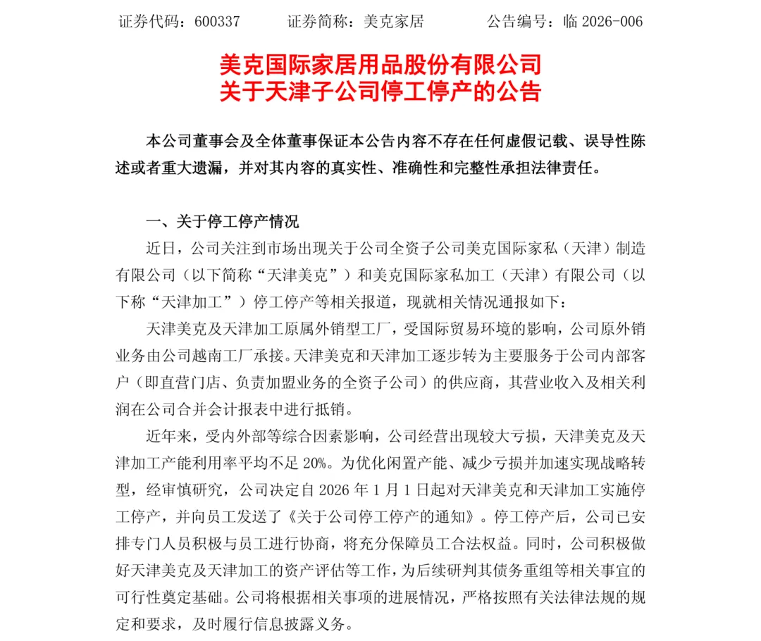 已于2026年1月1日起被关停的美克国际家私(天津)制造有限公司与美克国际家私加工(天津)有限公司,并非边缘资产,而是公司过去外销业务体系中的重要制造基地。