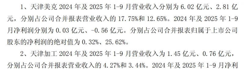 进入 2025 年前三季度,经营状况进一步走弱:天津美克收入降至 2.81 亿元,净亏损扩大至 5600 万元;天津加工收入仅 7600 万元,亏损仍在 1200 万元左右。