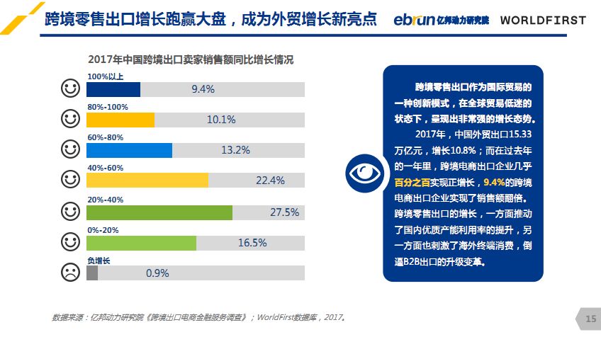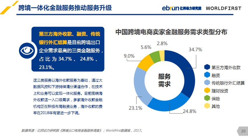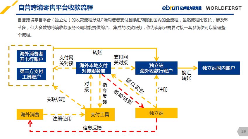 第三方跨境支付工具几乎是每个跨境电商的“刚需”,如果你还在用传统的海外本土银行收款,朋友圈都不好意思晒。如此大众化,想必人人都了解吧,事实恰恰相反,许多电商小伙伴对于跨境支付流程一知半解。 不了解怎么办,不要方!WorldFirst和亿邦动力研究院联合发布的《2017中国跨境出口电商金融服务白皮书》让你全面了解关于“跨境支付”的那些事,更有小编精心划重点! 揭开跨境支付的神秘面纱 白皮书中显示,国内跨境电商卖家金融服务需求最高的为第三海外收款,占比高达34.7%。 在海外进行收付款时过程是比较麻烦的,因为国内实行外汇管制,导致人民币在国际上无法自由兑换和流通。 这时第三方海外收款就应运而生,通俗点的解释就是,借助一个第三方收款账户将国外的资金转到国内的账户,这样人民币在国际上无法流通的问题就顺利解决。 白皮书中调查显示从2012年开始,第三方海外服务商才开始大规模的进入跨境电商领域,虽然还是“朝阳产业”,但凭借快捷、方便、易操作等特质,迅速占领大量市场份额,国内多数跨境电商以及外贸公司都在使用。 展示资金“漂洋过海”全过程 资金虽然是通过第三方收款工具转入国内的,但直接把钱交给“陌生人”带回国内,怎么想都觉得有些不靠谱,所以大多收款工具都会将资金交给底层银行托管,利用备付金托管账户完成资金流转。 重点来啦!在海外发生的支付资金其实是在商业银行的收款账户间进行流转的。解释起来也简单只需要举个例子。 一位亚马逊卖家账号绑定了WorldFirst账户进行收付款,交易完成后平台会显示收款成功,但资金并不直接付给平台,它会从消费者的银行帐户转到亚马逊委托的银行帐户,然后再经过WorldFirst海外合作银行转到国内,最后到达国内转进卖家国内账户。 解密跨境支付未来发展方向 从市场端来看,近年来跨境电商数量不断增多,2017年中国外贸出口15.33万亿元,增长10.8%。跨境电商市场的拓宽意味着需求增大,例如对可兑换货币种类的需求,与此同时资本端也会加大监管力度,对跨境支付公司的支付牌照以及合作银行会有更严格的把控。 今年中国金融领域正式对外资开放,其中可申请支付牌照类型为:互联网支付、移动电话支付(远程支付)。WorldFirst在业内持续领跑! 在此之前,WorldFirst已经在美国48个州、英国、欧洲等地拥有支付牌照,可兑换美元、欧元、英镑、加元、日元、澳元、新西兰元等常见货币,覆盖海外大多数的热门市场!