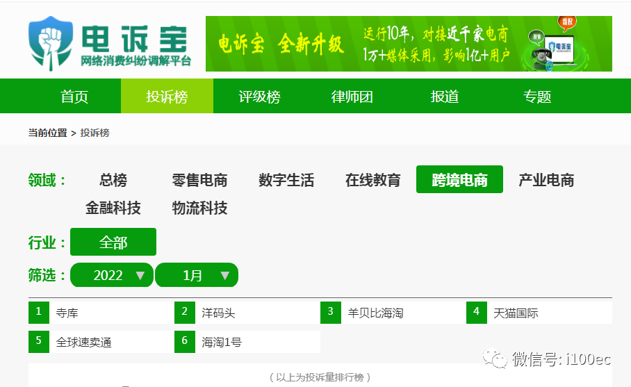 据国内知名网络消费纠纷调解平台“电诉宝”(315.100EC.CN)显示,2022年1月跨境电商领域的投诉事件按投诉量排序依次为寺库、洋码头、羊贝比海淘、天猫国际、全球速卖通、海淘1号等。(如果您是跨境电商业内人士,欢迎咨询加微信:zhangzhouping110)