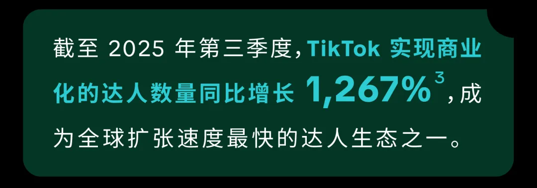而 TikTok 正在成为推动这场增长的关键平台 —— 一个由真实达人、真实内容与真实影响力共同构成的达人营销生态,正在迭代品牌与消费者的连接方式。从头部达人到素人达人,TikTok 拥有丰富多元、快速增长的达人生态,使品牌能够与具备真实种草力的达人实现精准匹配,广泛触达用户。
