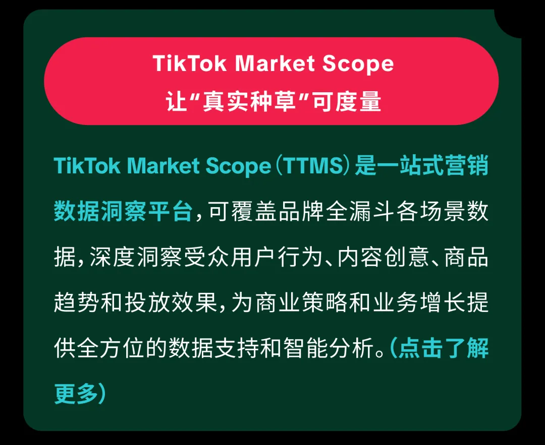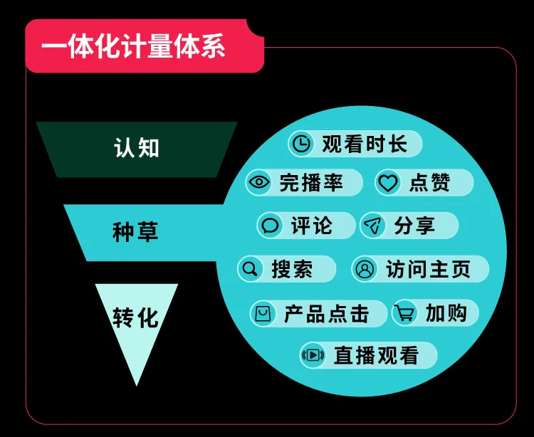 随着数据分析能力的演进,TikTok 已构建起一套计量科学体系,能基于 12 项可追踪的关键行为指标,对处于“种草阶段”的人群进行系统性解码,帮助品牌以更高精度识别并量化种草人群的规模,让用户流转路径可追踪。