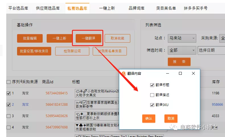 上架商品流程:编辑标题、批量编辑、批量设置/修改类目 --> 检测禁运词和黑名单类目--> 一键翻译 --> 一键上新。