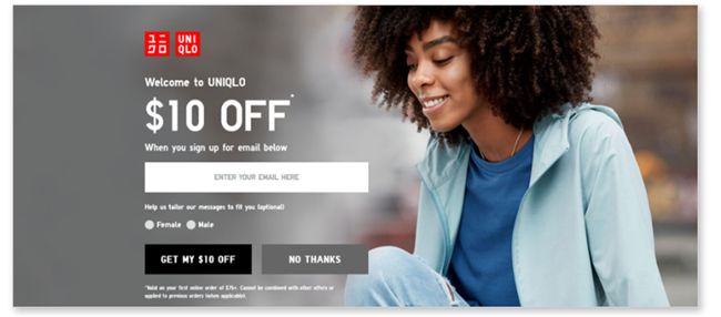 以优衣库为例,该公司网站会在新访客到来时弹出欢迎信息,给新访客有宾至如归的感觉,此外它还为新访客提供了一个温馨折扣,来吸引访客注意(如上图)。你可以在通过自动化营销插件Beeketing提供的小工具Better Coupon Box来制作这么一个欢迎弹窗。