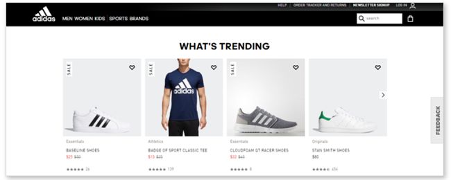 由于新访客不熟悉你的产品,你也可以想阿迪达斯一样在主页上展示你的热销商品或新品(如下图),让他们了解你提供的产品。