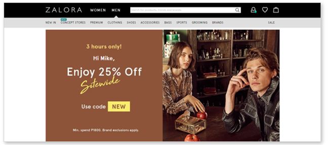 如下图,Zalora为回头客提供3小时的全站产品限时折扣。
