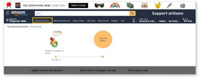 为用户提供浏览历史是一个电商网站应该具备的基本个性化技术,因此你也需要做到这一点。亚马逊以采用这种策略而闻名,当消费者再次进入亚马逊网站时,该网站会在导航栏中呈现一个“Browsing History”(浏览历史)选项卡,消费者只需简单点击就可了解自己过往浏览的商品,这些商品往往是他们最有可能再次浏览的商品。这不仅为消费者提供了良好的流量体验,也缩短了消费者的浏览时间,从某种程度上,这也意味着消费者转化时间被进一步缩短了。相关研究数据指出,这将使电商网站增加高达10%的销售额。