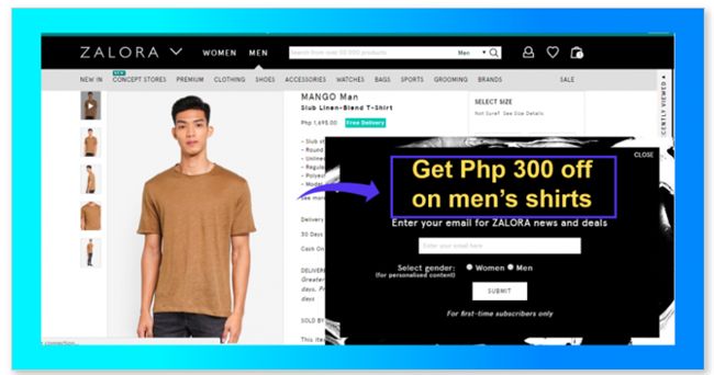 如下图,是访客在Zalora浏览男士T恤时,Zalora所呈现的呼吁行动按钮,它动态地根据访客的需要提供了折扣。