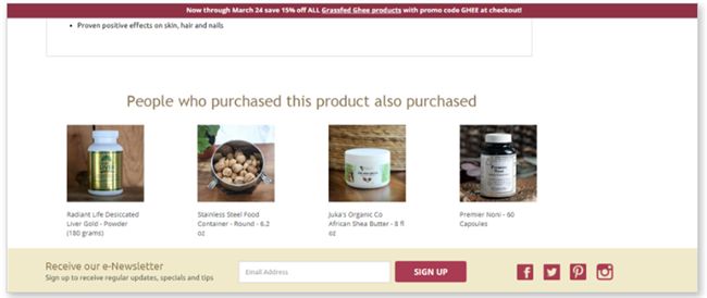 向人们展示购买了他们正在浏览产品的消费者还购买的产品,也有助于卖家的产品页面优化,因为这些消费者可能有相同的需要。如下图,Radiant Life就在起产品页面的底部添加了一个“People who purchased this product also purchased”(购买此产品的消费者还买了)板块,来向消费者推荐更多的产品。