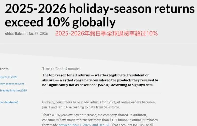 2025—2026 年假日季过后,全球电商退货问题进一步加剧。行业数据显示,整体线上订单退货率已 突破 10%,2026 年 1 月初节后关键节点,退货率一度达到 12.2%,同比上升约 3 个百分点。