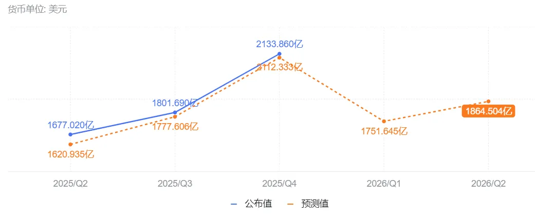 从 Q4 表现来看,亚马逊单季营收 2134 亿美元,同比增长 14%。其中,北美业务营收 1271 亿美元,同比增长 10%;国际业务营收 507 亿美元,同比增长 17%;AWS 营收 356 亿美元,同比增长 24%,创下 13 个季度以来最快增速。第四季度营业利润 250 亿美元,净利润 212 亿美元,整体盈利能力继续增强。