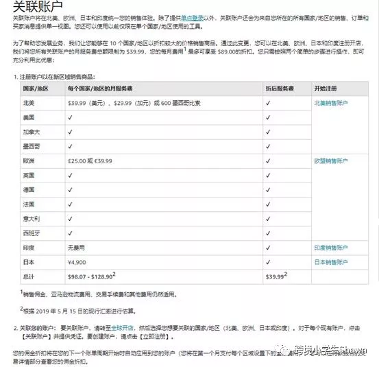 为了拓展国际业务,亚马逊目前为您提供 $39.99 的月服务费优惠价格。通过支付这笔月服务费,可以在 10 个国家/地区销售商品。即刻注册在北美、欧洲、日本和印度开店,亚马逊会将您所有账户的月服务费总额减至 $39.99,即每月优惠多达 $89.00。