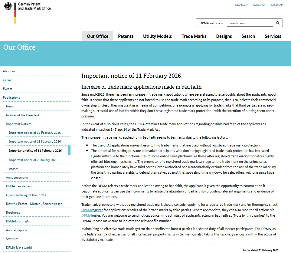 2月11日,德国商标局发布了一则重要通知,他们表示,对于2025年中以来恶意注册商标数量增加的情况,已经引起了高度重视。后续,在出现可疑案件时,会强化审查,从源头遏制不正当竞争。