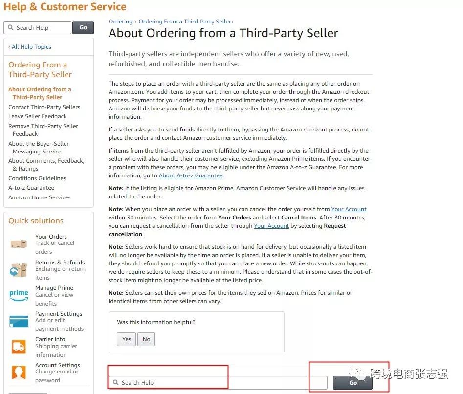 通过买家身份,用这个路径进行测试购买投诉,投诉内容可以是这个跟卖的卖的产品与描述不一致,或者是假货,或者还能在这里开A-TO-Z 。在这个界面搜索自己需要的帮助。