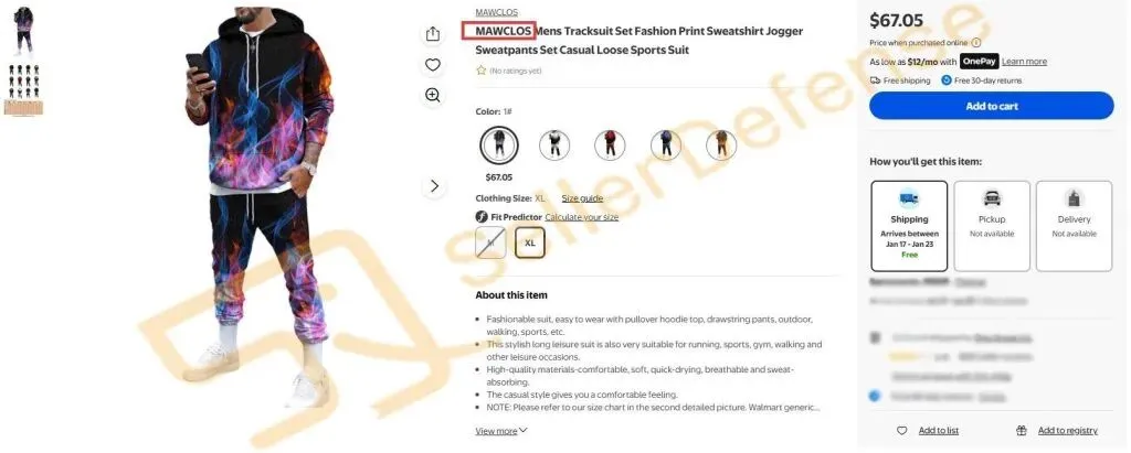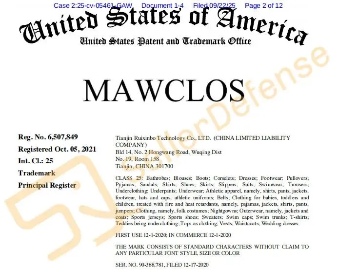 原告 BINGSUN INC 通过其授权的线上商店和 Walmart 上销售带有 MAWCLOS 商标的服装和鞋类商品。该商标注册在第25类服装鞋帽:浴袍;女式衬衫;靴子;紧身胸衣;连衣裙;鞋类;套头衫等。