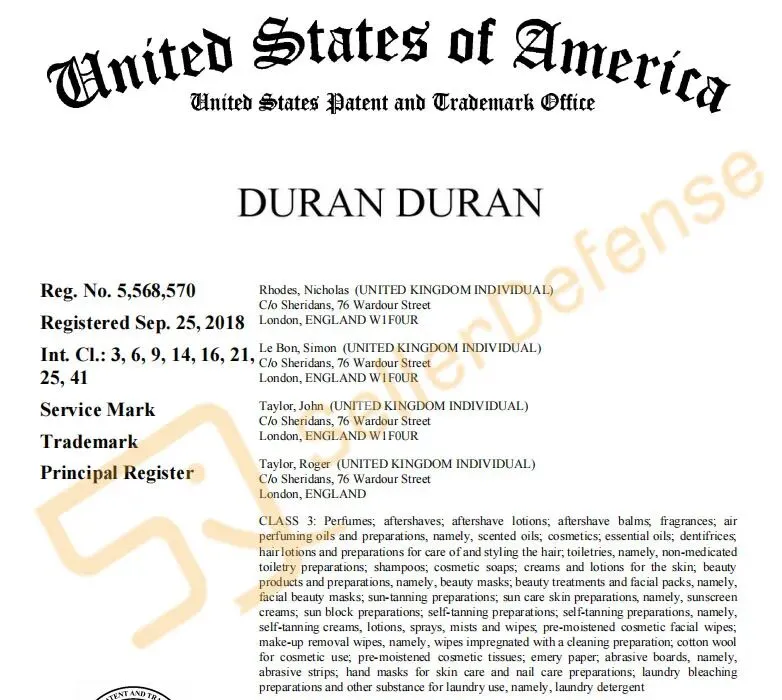 原告是格莱美奖得主、英国摇滚乐队 Duran Duran 的成员。乐队从1980年的另类音乐新星成长为主流的全球流行巨星,知名度极高。案件涉及商标注册在多个类目,请相关卖家注意排查避雷!