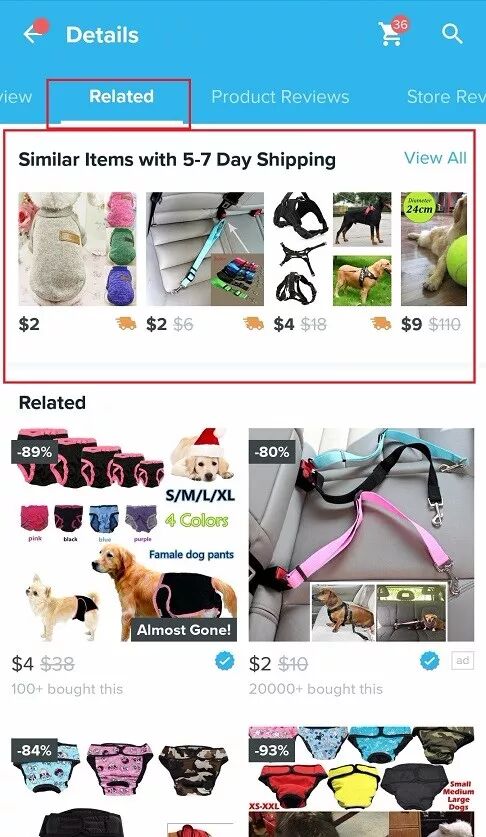 尤其是Wish APP端,用户选择一项非Wish Express海外仓产品时,在产品详情页,更有“Related”标签页置顶展示相似的Wish Express海外仓产品,浏览量相当高哦~