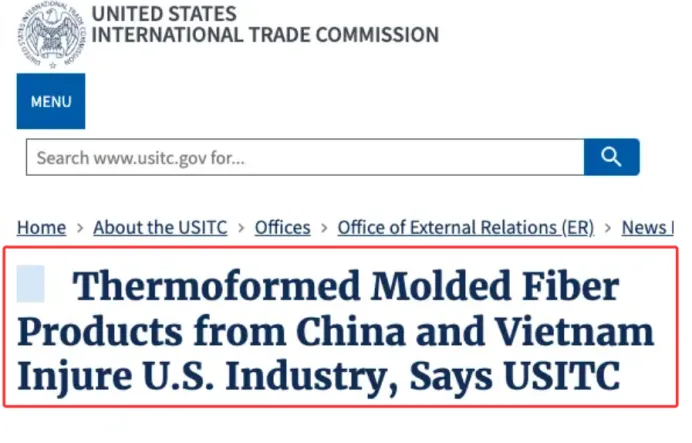 近日,美国国际贸易委员会(ITC)宣布一项裁定,美国产业因进口“来自中国和越南的热成型模压纤维产品”而遭受实质性损害。紧接着,美国商务部确定自2026年1月23日起实施相应的反倾销与反补贴税令。而中国相关产品所面临的最严苛税率,竟突破了540%的大关。