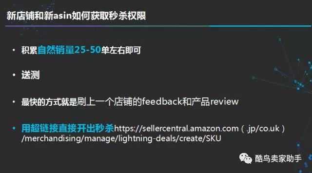 日本top3大卖--大兵 “我们很多黑科技的基础运作都是莆田人提供的,可能一个很小的点,却能够被莆田卖家不断的放大,而我们只是通过基础发现了一些不一样的东西,莆田人的精神值得我们学习。” 不要嫌小撕鸡啰嗦 碰上三观一致还这么牛逼的人 得让我感慨两下嘛... 整理好发型回归正题 大兵此次分享的内容不少 而且都是黑科技! 小撕鸡喧宾夺主的简单讲解一下 来到现场和看直播的可以复习 没来得及看的请端好你们的小板凳坐好 因为真的都是干货! (文末还有大兵本次大会PPT以及酷鸟卖家助手红包福利) 1 怎么玩转僵尸listing 如何找僵尸listing 卖家所建的listing,不论新旧,都是隶属于亚马逊的,那么多商品,有一些都已经是卖家没有在销售的了,或者一些产品已经更新换代了,但它们却还是一直存在的; 我们想要找到僵尸listing,首先就得从海量的商品中去寻找,怎么区分就很重要了,大兵说,没库存、断货状态的商品就是僵尸listing的判断标准; 同时,大兵提到爬亚马逊前台的商品,最多的确就400页,且都是当前在售的,没有什么太大意义,找僵尸listing还是要找3个月以上没有卖家(不论自建跟卖与否都没有)的比较靠谱; 大兵以该商品举例 从去年12月份至今都没有卖家销售 这个商品可以直接使用修改 如何修改僵尸listing 1 做自己的网站,把产品的UPC码放入,截图,开Case修改; 更改的过程中,需要注意一些当地(站点)的品牌,为了保护自己的大号,还是要用小号来进行更改操作; 2 Asin比较多的情况下,可以用表格批量把品牌修改成我们卖家想要改的品牌,快,但是成功率相对来说会低一些; 如何合并僵尸listing 同样,为了安全,合并listing也需要应用小号操作,小号修改僵尸listing,安全起见可以在僵尸listing上建变体,大号跟卖新建的变体,跟卖之后把原修改的listing库存调成0,那么我们产品的review既能显示,又足够安全,风险降低很多,最多也就是得到个警告; 2 老产品打上新标签 大兵成为日本站大卖不是没有道理的,日常总是会去观察一些站点上的细节; 比如说一些产品已经销售很久了,却一直含有新品的标签; BSR排行入口的new releases 在亚马逊上,新品的扶持流量是很大的,流量会比老的产品来的更容易一些; 有一些老的产品推不动了,可以试一试在后台把listing删除,之后用表格上传,在日本站日期会刷新,并且出现新的标志,虽然用表格上传不一定是每次都能成功,但是多上传几次就可以了,有的产品甚至可以一直用这一招玩; 3 怎么人为干预Amazon Choice Amazon Choice对产品的转化有一定的提高,而如何快速获得Amazon Choice也是有一定方法的; 用下方的超链接 https://www.amazon.com/gp/aws/cart/ add.html?ASIN.1=B01DGVDLFU&Quantity.1=1 直接修改链接中的ASIN码进入,把产品加入购物车,wishlist就可以使产品出现Amazon Choice的,用测评、刷单都用该链接即可; 一些卖家小撕鸡是真的很喜欢的 说干就干! 可就拿一个买家号操作 好歹也尊重一下亚马逊机器人的智商吧! 之所以说是人为干预,就是因为要一定量,一定周期的累积; 4 新店铺、新产品怎么获取秒杀权限 秒杀连排是前一阵玩的比较凶的一种玩法,小撕鸡也跟几个酷鸟的用户介绍过,有的成功了,有的没成功,当然这不是重点,重点是亚马逊后台是不会有新品的秒杀推荐的; 经大兵亲测,一个新店铺只要有一个Feedback,且产品上有一个review,用https://sellercentral.amazon.com(.jp/co.uk)/merchandising/manage/lightning-deals/create/SKU 这条链接可以直接开出秒杀,且全站点通用「括号内是站点域名后缀」; 当然,不仅仅只是这一种方法 大兵推荐的3中上秒杀方法 但大兵强调,这样的方法最快 5 获取review的几种方法 1 移花接木-转移listing风险 为了保护自己的主号,需要通过小号1建listing上review,小号2建变体合并小号1的listing,等到安全之后再用大号跟卖小号2的listing,使主号更加安全; 2 刷单-黑号风险急剧增加 上期文章中,小撕鸡提到了刷单的一些基本逻辑「点击这里回看上期文章」,大兵在会上恰巧也说到这个问题,有很多买家投诉没有消费,却收到了卖家寄送出来的商品,于是通过order number跟亚马逊反查,导致不少卖家刷单之后被封号,由此可见收件地址就成了大难题; 用酷鸟真实邮箱获取,和店铺里的买家取得联系之后,转化自己的线下收货资源,沟通好了再发货,就可以规避这个问题; 这一波广告 请用臭不要脸夸我... 当然,如果卖家自己有资料的话,自然要用白号; 3 测评,坚持用老外测评 我相信不少卖家都有测评群,而且绝对不止1个,海量测评群导致的结果就是资源重叠,质量不高,且亚马逊一查就死一片,因此还是要用老外的测评,当然,不排除亚马逊有一些钓鱼执法的行为存在,所以资源很重要; 4 用僵尸listing的review完成新listing首期review 有意建立一些中性的评价,作为种子listing,当有新品上的时候可以调用这个listing,品牌一样时可以合并,使用拆分变体的方式,把库存调成0,完成前期review积累,原理和僵尸listing逻辑一致,但绝对安全; 6 Url中的关键词收录 在美国站任意一个链接Amazon.com后面都会有5个关键词,是被亚马逊长期收录的 为了有倾向性的让亚马逊选择这些关键词,可以提前在变体里面只写5个关键词让亚马逊收录; 等待一周左右亚马逊就会将这五个词收录,再完善title即可; 7 关于日本站选品 最后,作为日本站大卖,大兵还给了现场卖家一些的选品建议,去年小撕鸡的文章也专门写过大兵关于日本