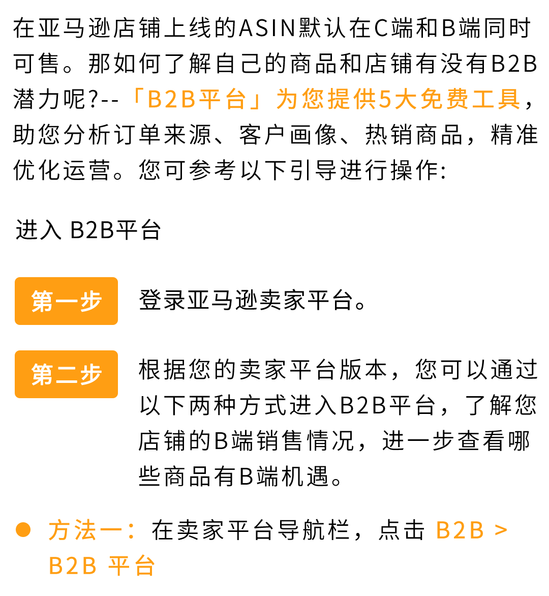 《亚马逊双轨增长指南》PDF下载亚马逊以“以客户为中心”为核心理念,通过整合B2B与B2C的全渠道服务,帮助卖家实现“一店双拓”-- 一次上架,同步触达个人消费者与企业买家,获得双重收益。同时,基于Direct to Buyer(直接触达买家)的模式,更能有效减少中间环节,提升利润空间与品牌掌控力。