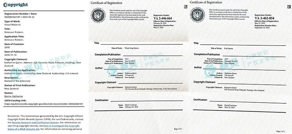 此次 Katherine Quinn维权的是3项联邦注册版权,分别是: VA 2-463-187《Dinosaur Pattern》(恐龙图案); VA 2-462-854《Fish Pattern》(鱼类图案);VA 2-446-664《Whale Song Pattern》(鲸鱼之歌图案),目前图案尚未公布,赛贝在原告官网查找了以下图片,供卖家参考,赛贝提醒跨境卖家,未经授权不得擅自使用 Katherine Quinn的作品,以免引发侵权风险。