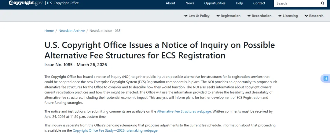 美国版权局就电子版权登记收费价格上调做出通知,上调43%!