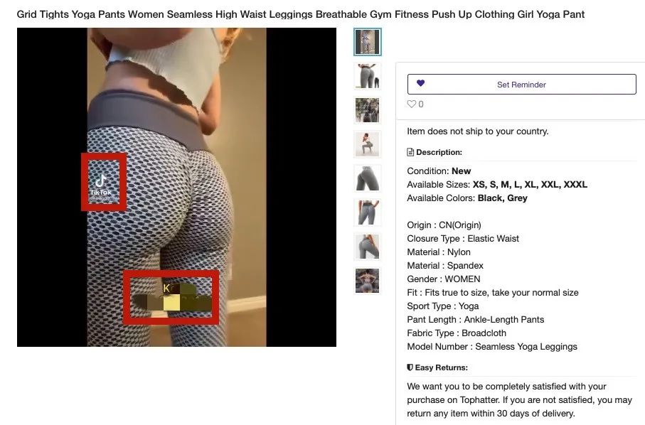 K先生店铺的另一个实例,是从某一瑜伽裤视频链接截取的图片,通过人物的动态活动,视频listing将瑜伽裤的强力拉伸、柔软贴身的卖点展示得更加淋漓尽致。在视频正中间,K先生放上自己店铺的logo,保护自己的创作权益。