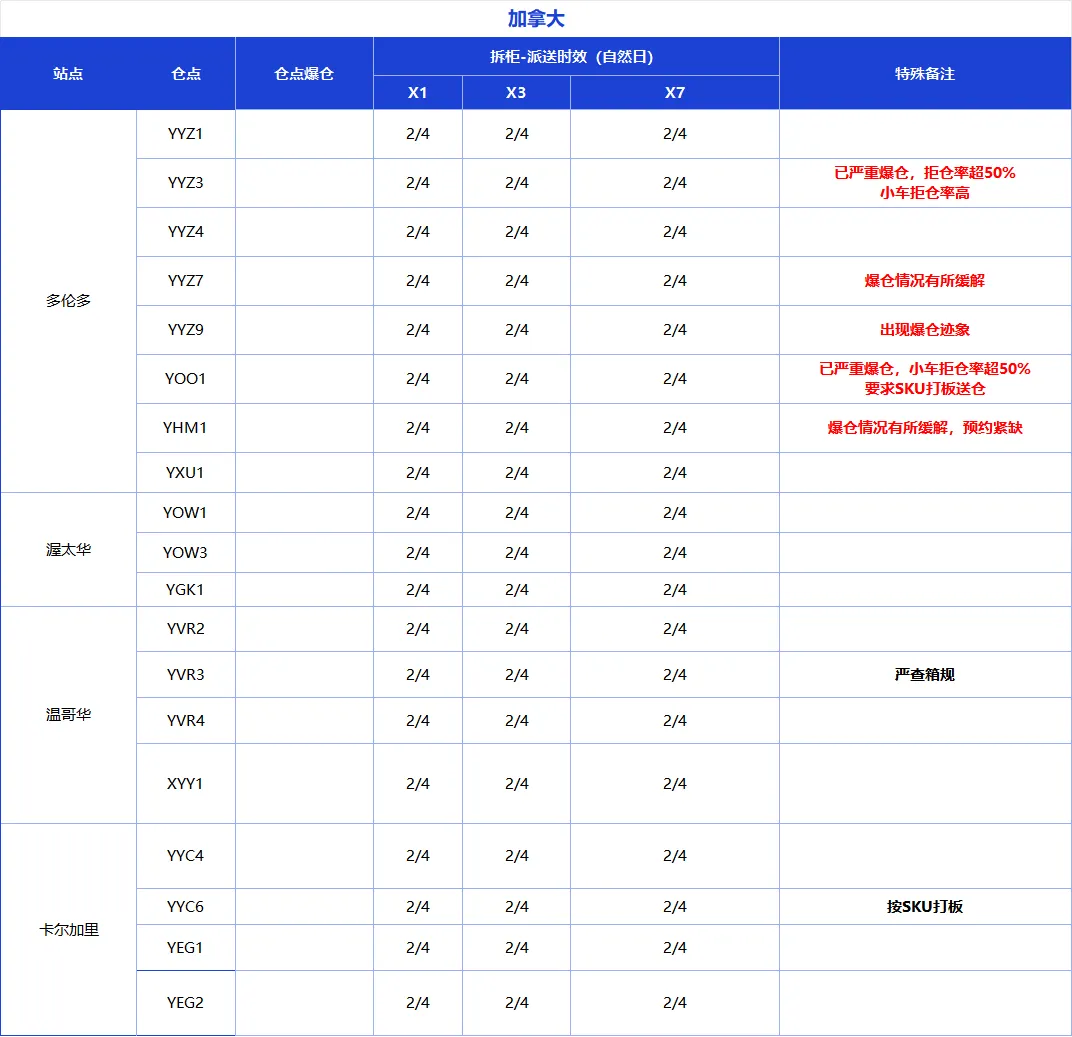 加拿大部分仓库近期情况如下: