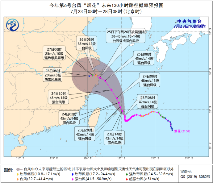 据7月23日的情况,“烟花”正在逐步逼近浙江,最大可能于25日下午至26日凌晨在浙江省中北部沿海登陆,浙江省气象台已发布台风警报。根据上述情况,浙江省气象局于10点30分将重大气象灾害(台风)业务服务应急响应调整为Ⅱ级。