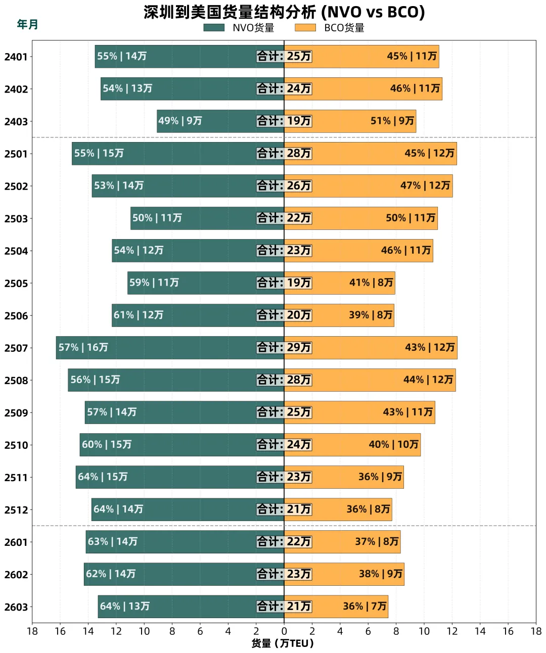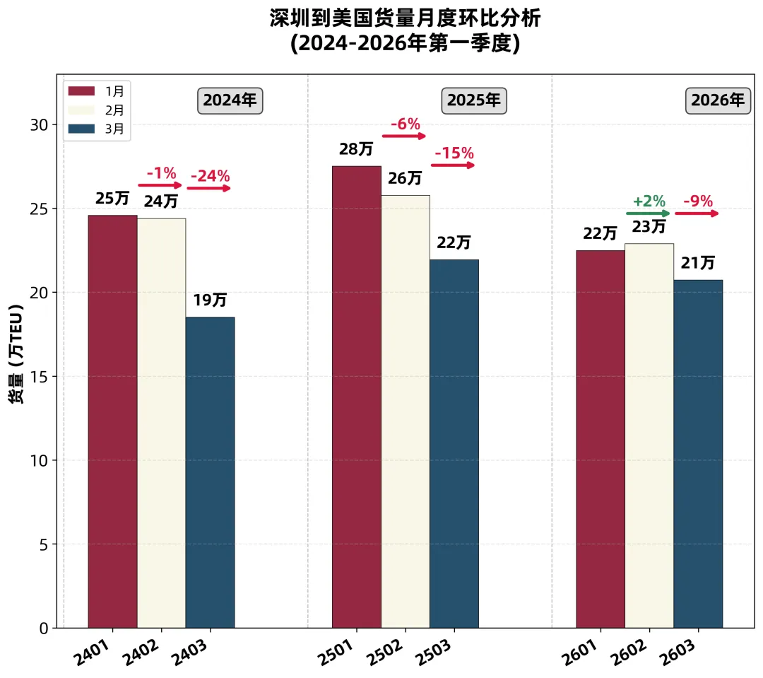 🔹 大盘收缩,货代逆势突围:从上图可知,2026年一季度深圳整体货量降至去年同期的88%,但货代(NVO)货量不降反增,3月达13万TEU,创近三年新高