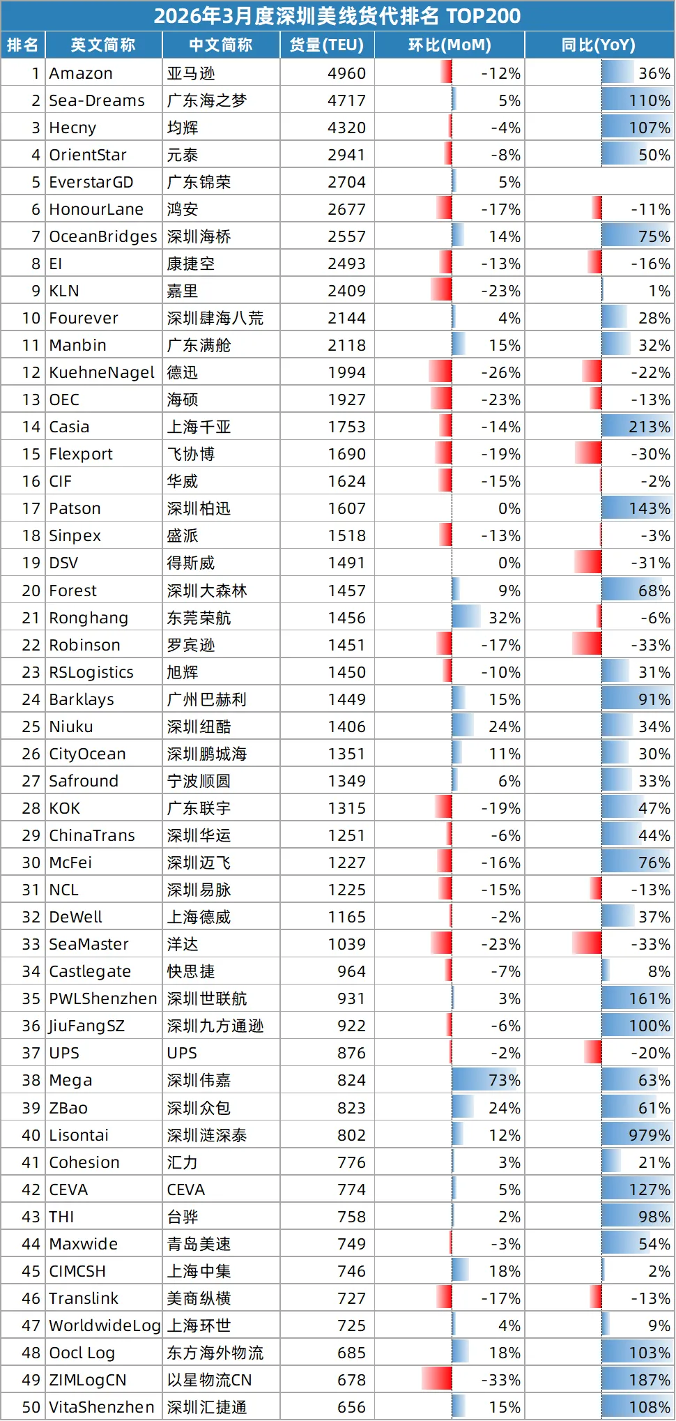 深圳美线货代排名TOP200(202603)